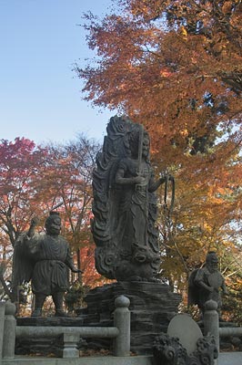 仏舎利塔の前には飯縄大権現と天狗像が建てられている。