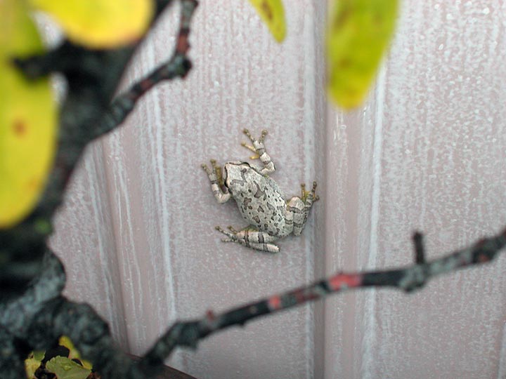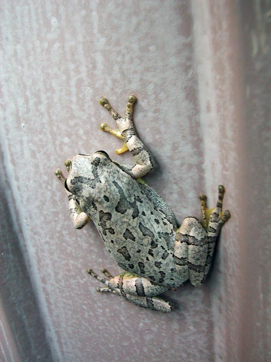 台風がやって来る前の日、アマガエルが出てきた。壁の色に合わせて色が灰色になっていた。