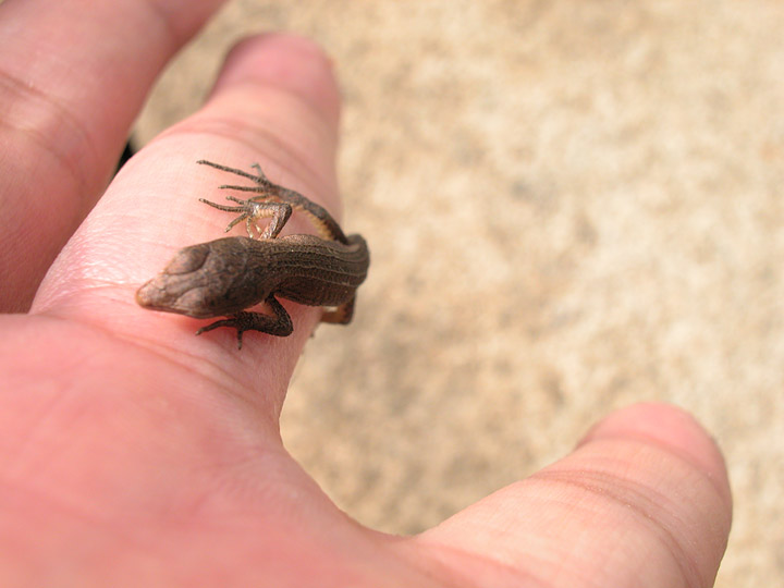 この後、ブロックの上に手を置き、カナヘビにチョイチョイと触ると、逃げていった。