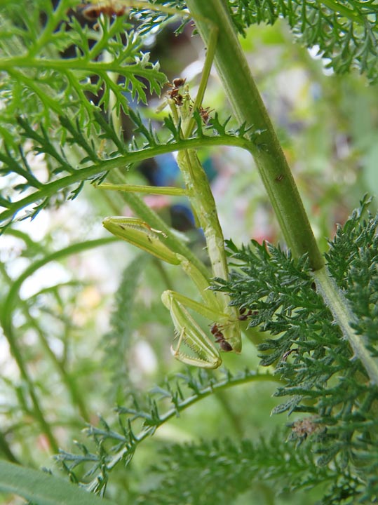 ところが、それから数時間して様子を見ると、アリがたかってカマキリは無惨な姿に。