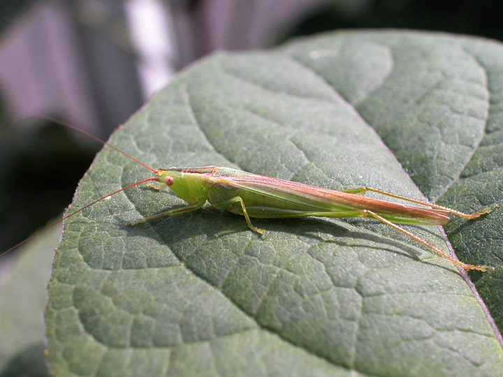 背が高めの草の葉に止まっていたウスイロササキリ。