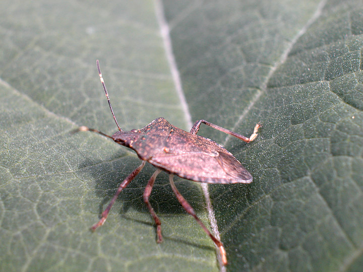 このカメムシもウスイロササキリと同じ草の風に揺れる葉の上で踏ん張っていた。