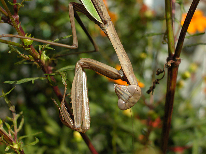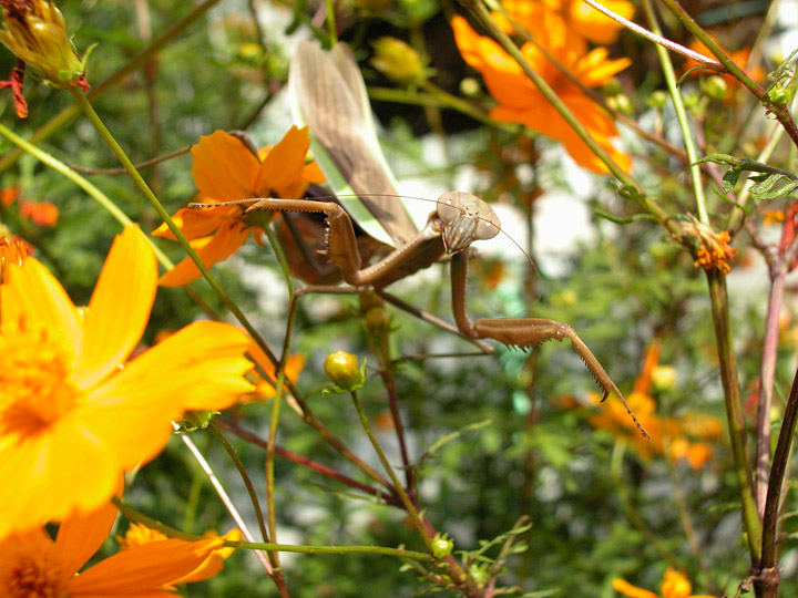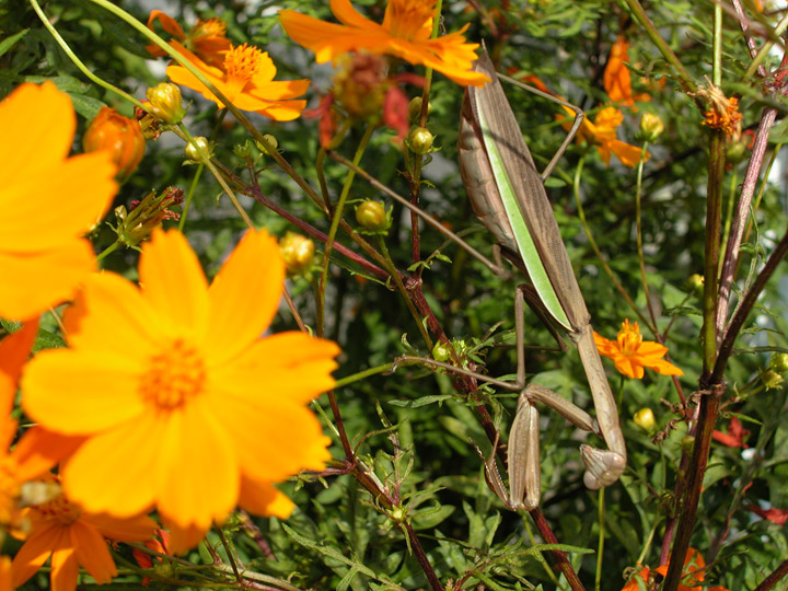 昨日はキバナコスモス目当てに集まる昆虫の捕食者としてコハナグモを紹介したが、今日はおなじみ、オオカマキリ♀。