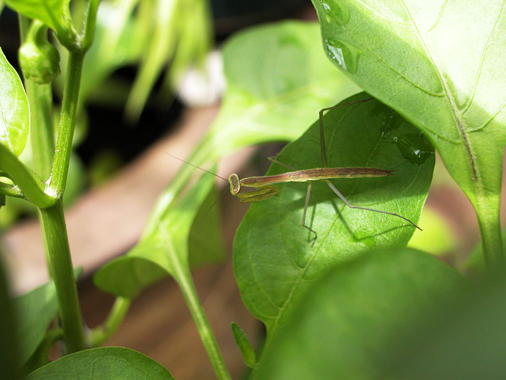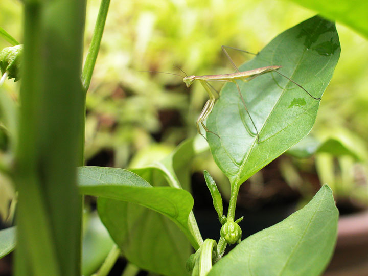プランターに植えたピーマンの葉の上にオオカマキリの幼体を発見。