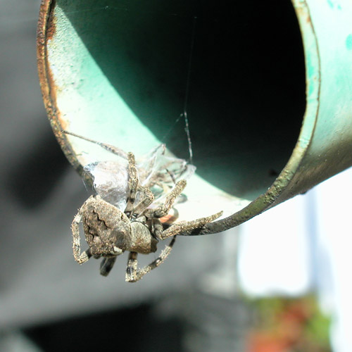 先日トイレで用を足している時、ふと窓の外をみると蜘蛛が巣の上で一生懸命何かを糸でグルグル巻きにしているのを発見。