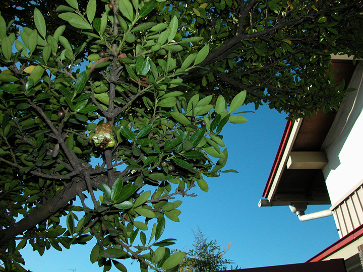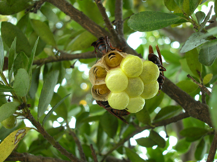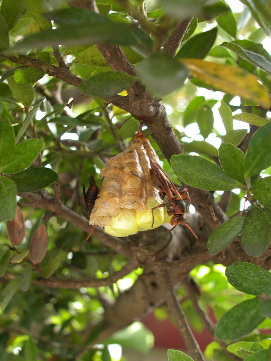 事実、玄関の近くにあるこの巣の前を行き来していても、蜂は微動だにしないし、この木に絡まっていたゴーヤのツタを荒く取り払っても、変わりなし、さらにデジカメを5cm近くにそっと近づけても、蜂は大人しいものだった。