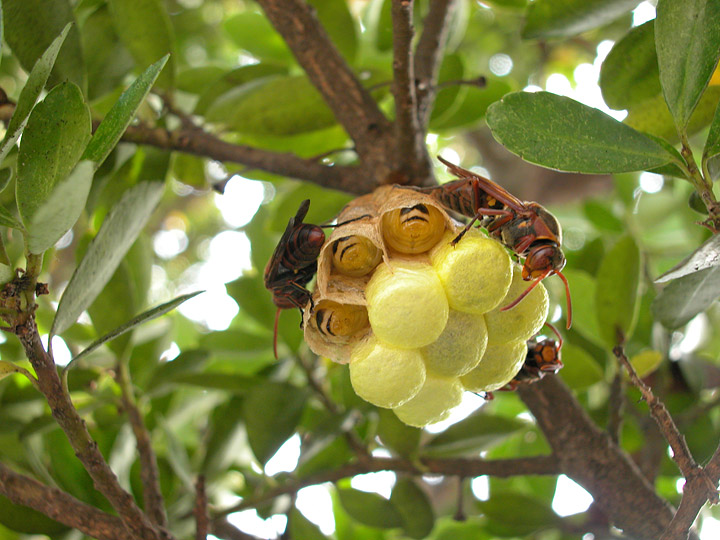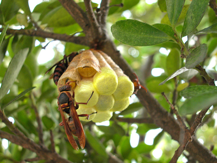 ヤマトアシナガバチ キボシアシナガバチの性格は「威嚇性、攻撃性はアシナガバチの仲間ではもっとも弱く、巣を直接刺激しない限り刺される心配はありません」とのこと。