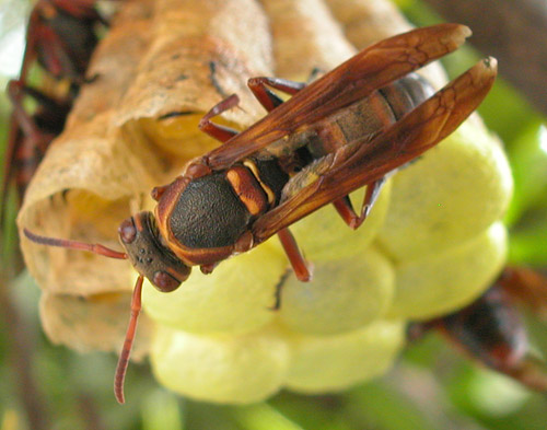 ヤマトアシナガバチ キボシアシナガバチの幼虫と成虫の正面を拡大。