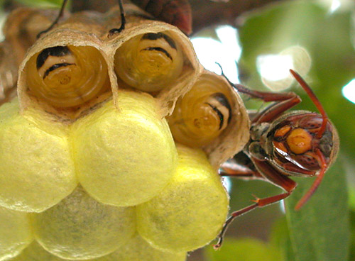 親蜂の強面と比べて、サングラスをかけたような幼虫の顔がユーモラス。