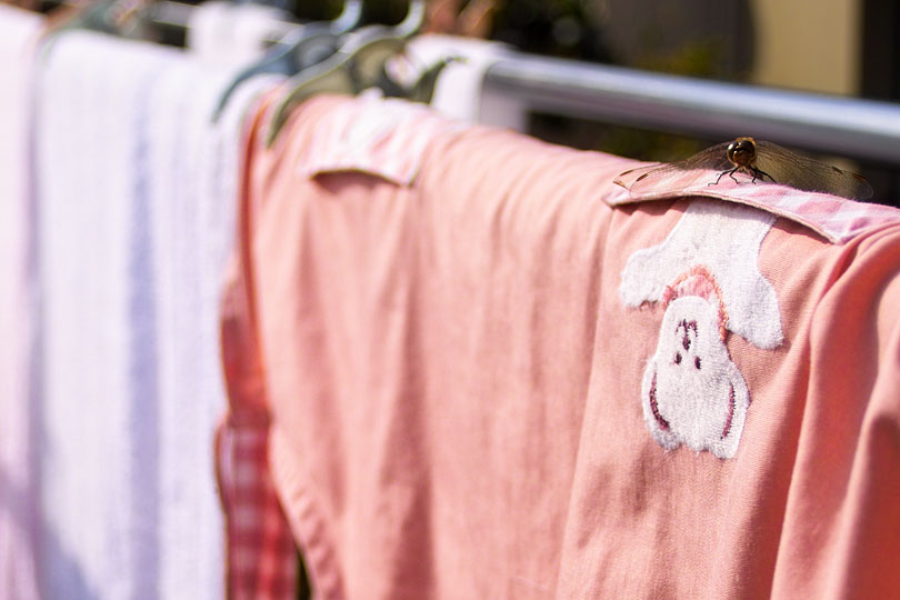 クマのキャラクターがついたエプロンに留まるトンボを撮影。