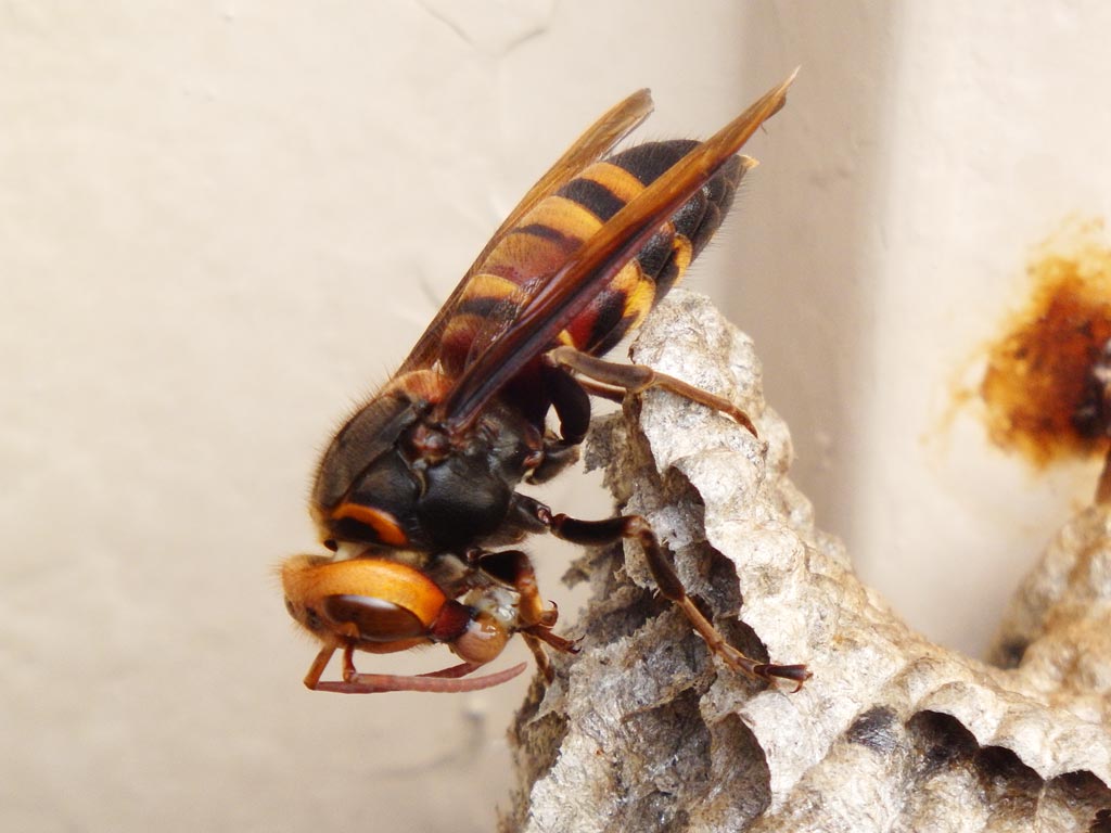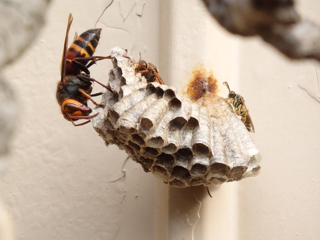 2022年6月20にコアシナガバチが3、4匹しかいない小さな巣を見つけてから2か月、とうとうスズメバチに見つかってしまった。