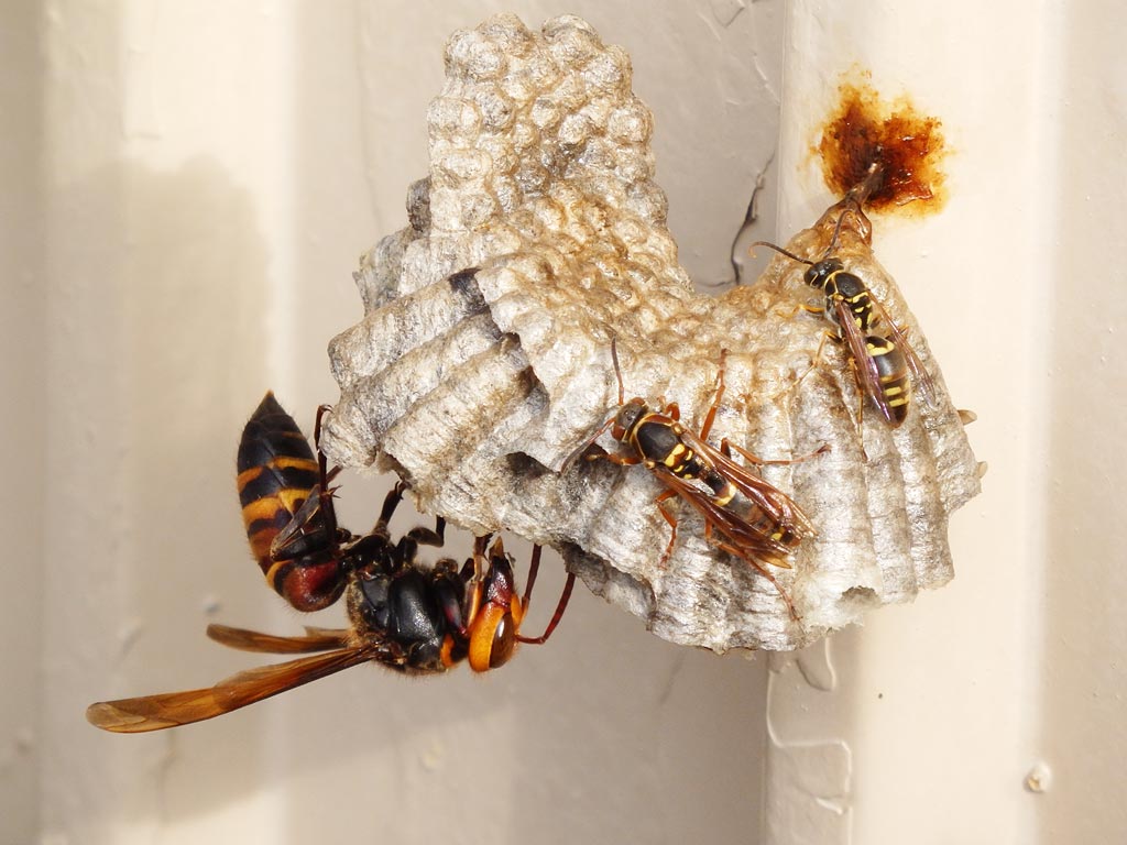 コガタアシナガバチの巣を襲っているのは、おそらくヒメスズメバチ。