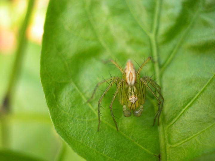 先日、家庭菜園のナスの葉にいたササグモが、今日はピーマンの葉に現れた。