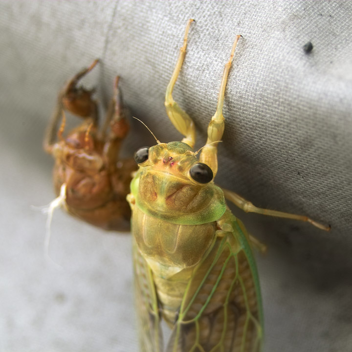 アップで見て初めて気が付きましたが、セミの複眼の間に3つ赤くてキレイなものが付いています。