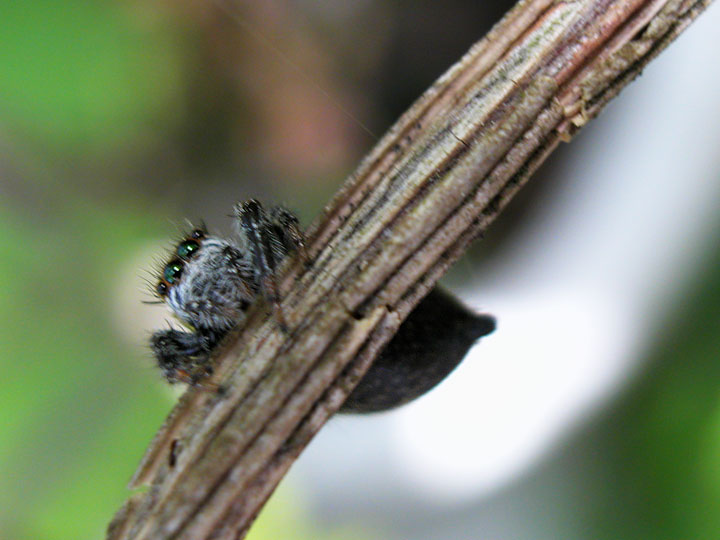 家の庭で腹の大きなマミジロハエトリグモを発見。メスのようだ。