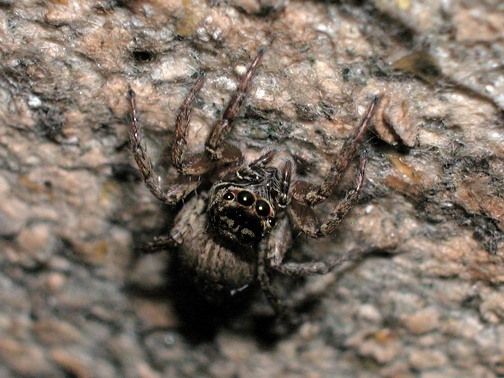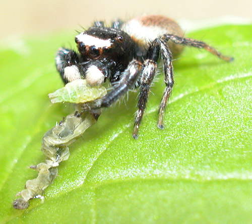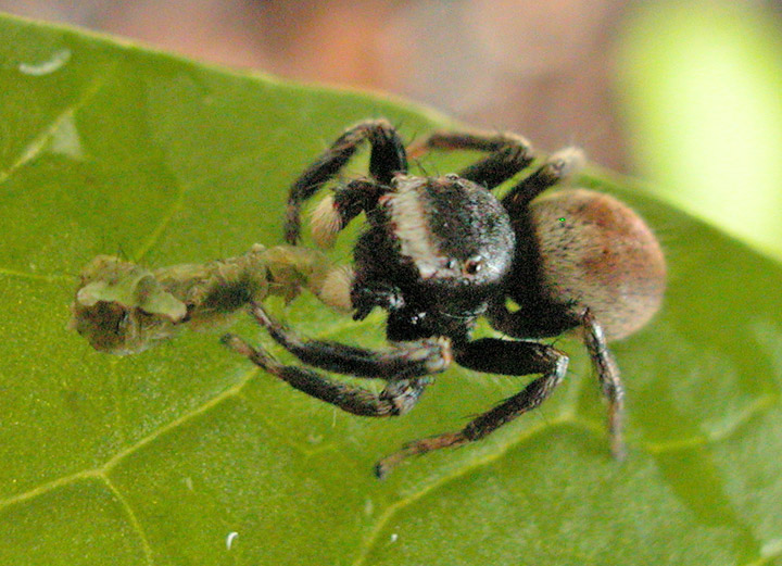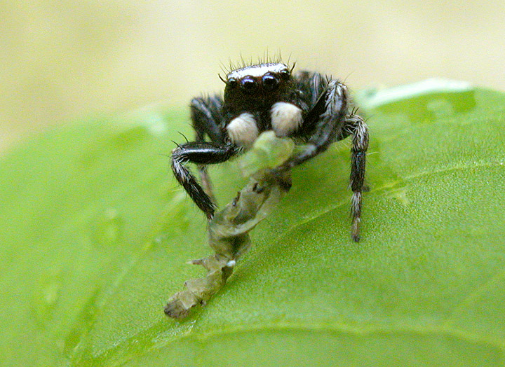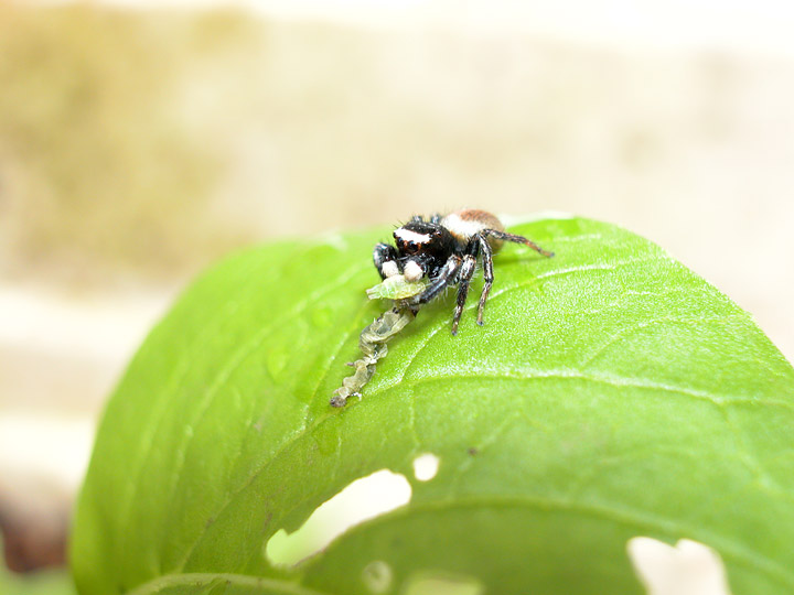 小松菜についている青虫を駆除しようと、小松菜を植えているプランターへ行くと、葉の上にいる蜘蛛を見つけた。