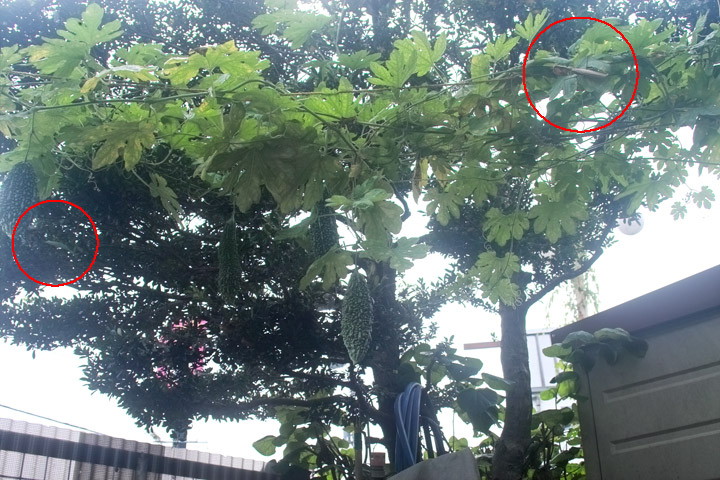 朝、母が花に水をやろうとした時カマキリを見つけ、水がかからないようにと気を利かせてゴーヤの所に移そうと捕まえたところ、思いっきりカマでやられてしまい、こんなことになってしまったらしい。