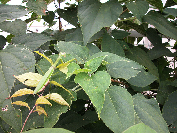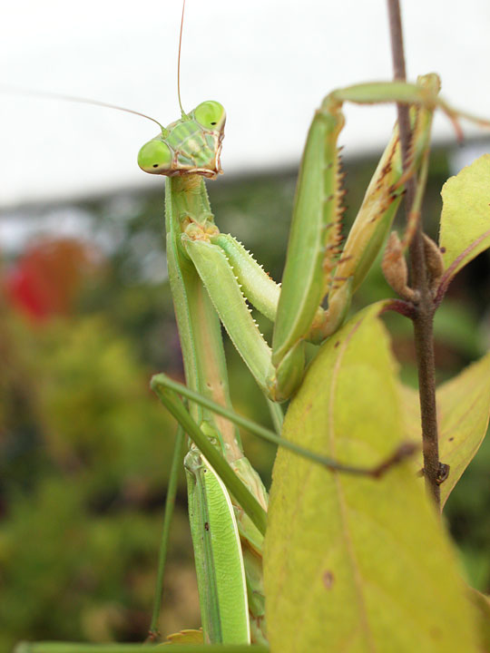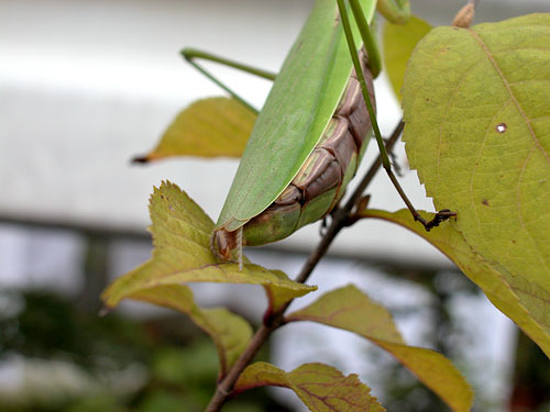 直接つかむと、カマでやられるし、カマキリにもよくなさそうなので、切った枝に掴まらせて撮影