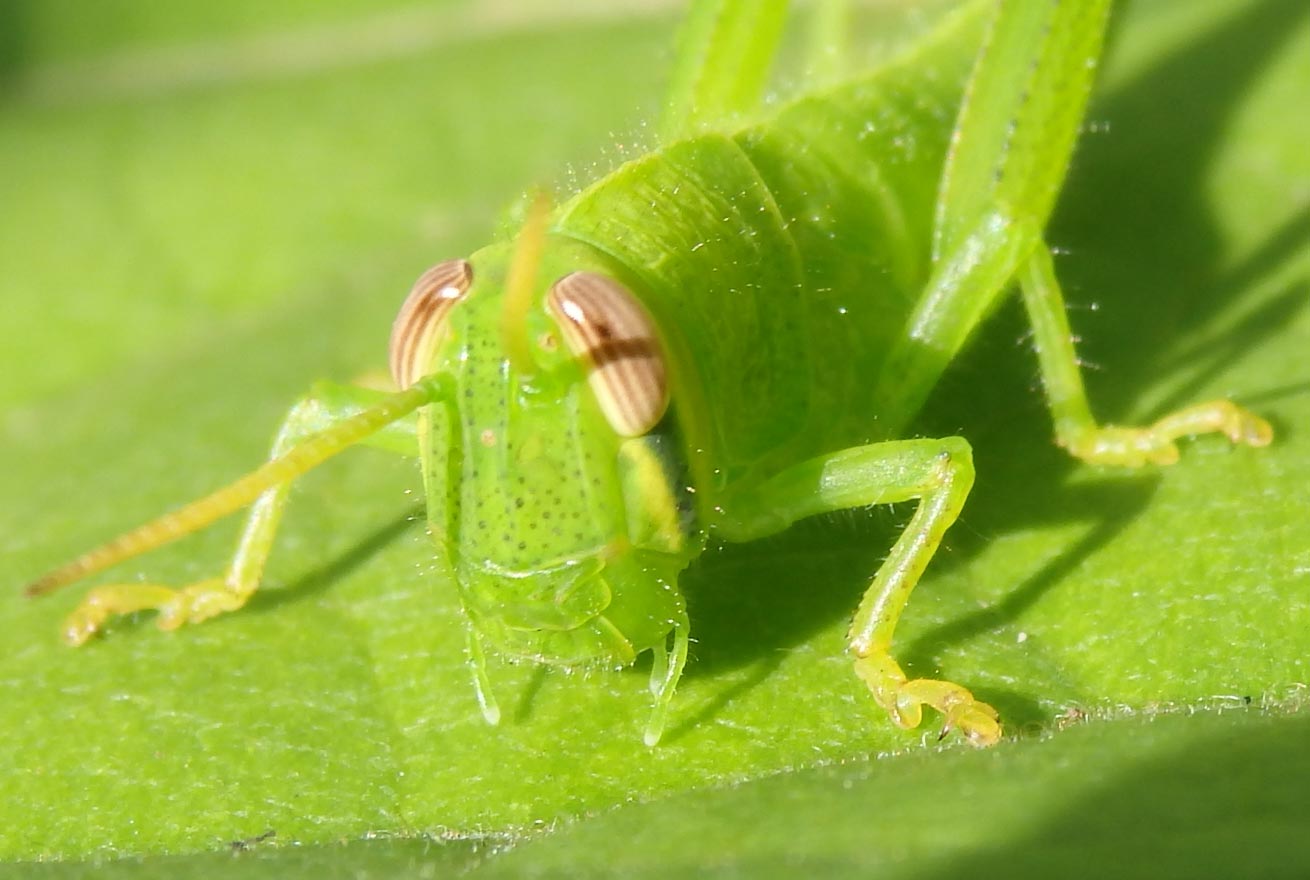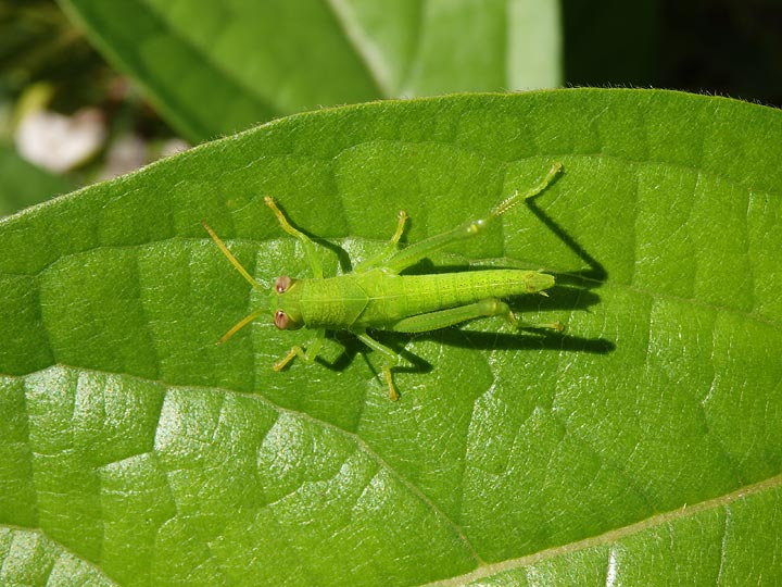 食後の柿の種から芽を出した柿の葉にツチイナゴの幼体がいた。
