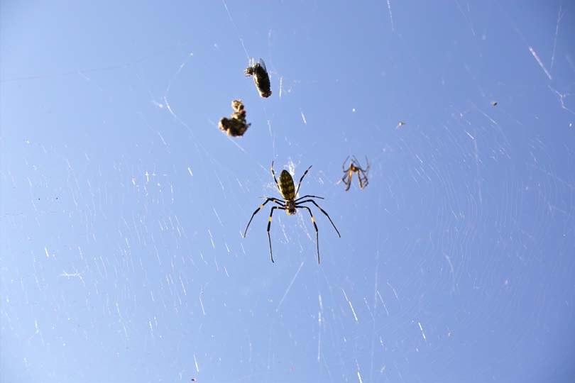 家に大きいクモの巣が出来ているなと思って見ていたら、その巣を間借りというか一部使って小さいクモが別の巣を張った。