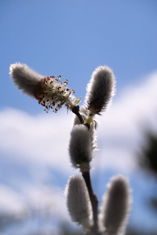 ふさふさのネコヤナギから花粉をつけた雄しべが出現。
