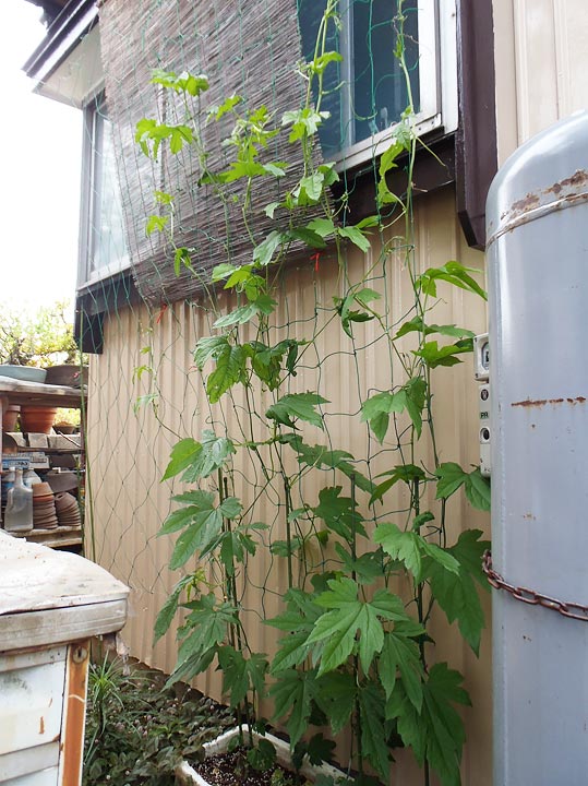 ゴーヤが窓を覆うほどに延びると、台所の温度が下がるのが分かります。