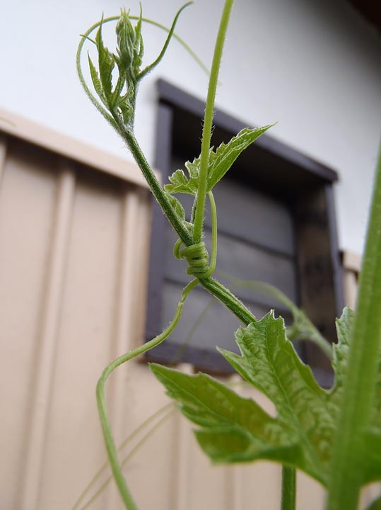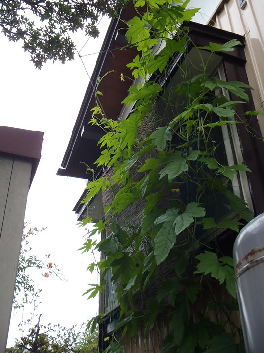 ところが、二週間も経つと、葉は大きくなって窓を覆い始め、ツルは掴まる先を求めて、あちこちに手足を伸ばしています。