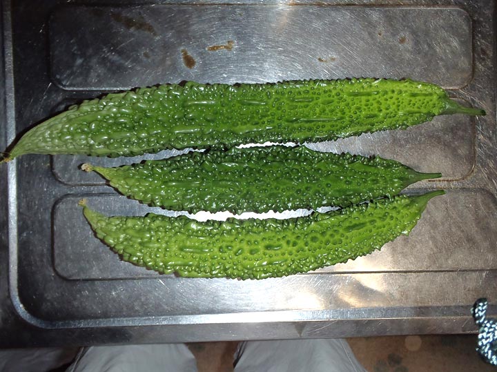 収穫した3本のゴーヤ。