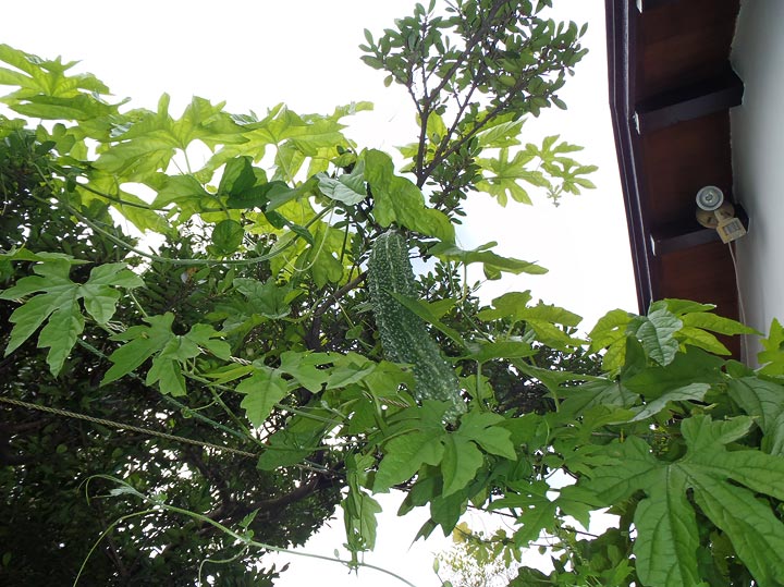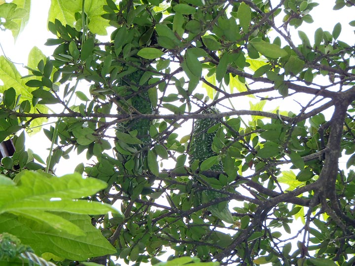 見上げると、木の枝の上にもゴーヤ。