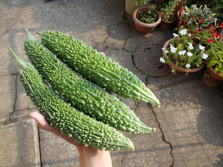 収穫したのは、『我が家のゴーヤ:2013年8月8日』の、写真一枚目の2本と、写真二枚目の一番左のゴーヤです。