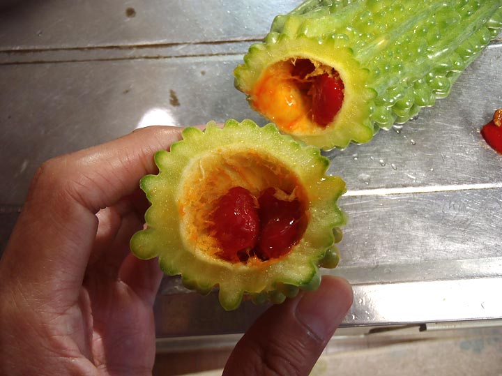 冷蔵庫で保存しておくのに、黄色い部分だけを切ってみると、種は赤く熟しています。