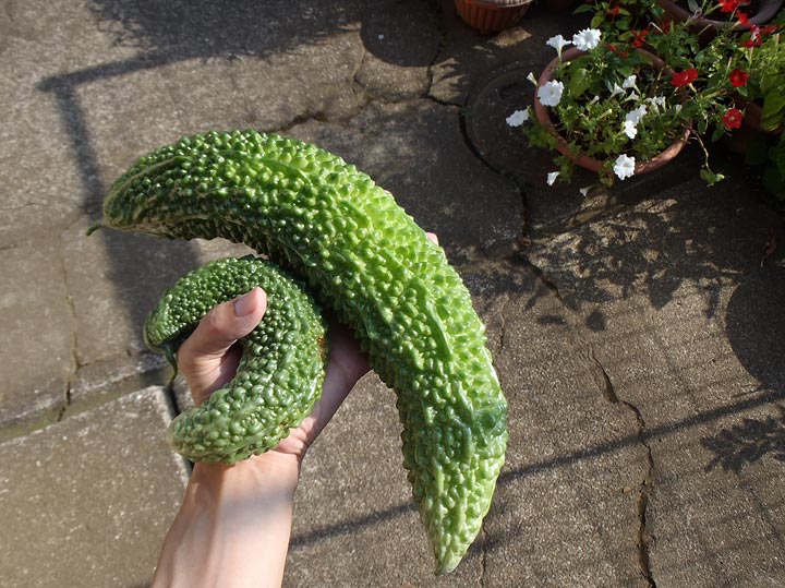 大きい方のゴーヤは、手で掴んでも指が回らないほどの太さ。