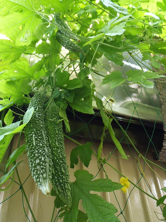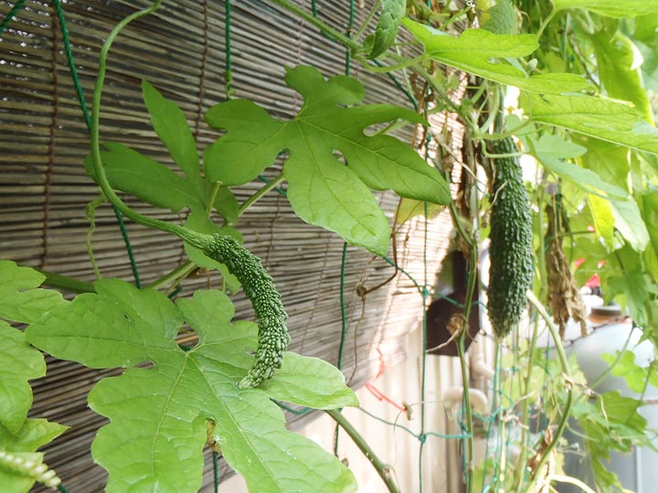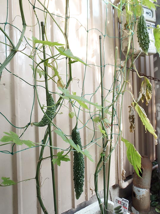 今までは、3本植えているゴーヤのうち、中央と右側にばかり実がなっていましたが、今回は、左のゴーヤに4本も。