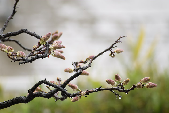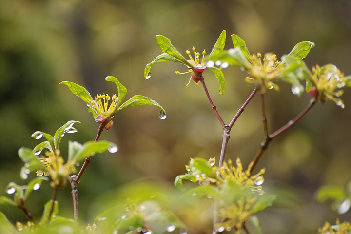春の雨に濡れる山茱萸(サンシュユ)と藤を撮影。