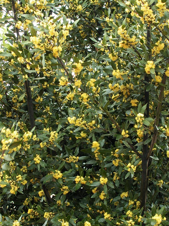 毎年大量に黄色い花を咲かせる月桂樹の花。