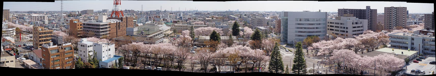 市役所の展望台から、市役所前通りから一本西にある通りの桜並木をパノラマ撮影。