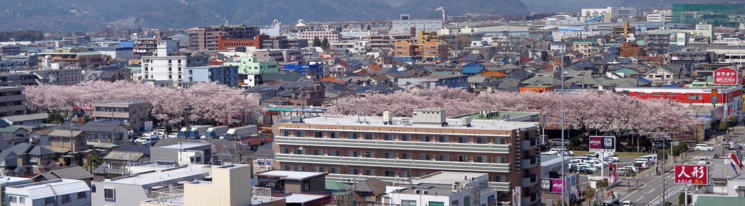 市役所の展望台から、市役所前通りの桜並木をパノラマ撮影。