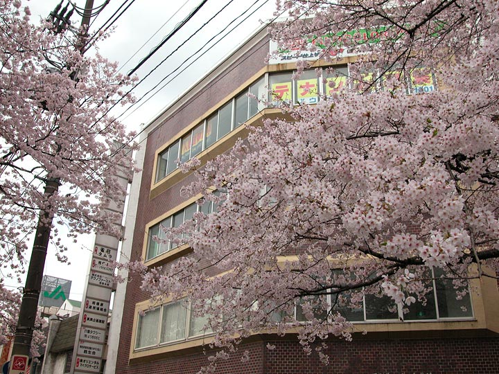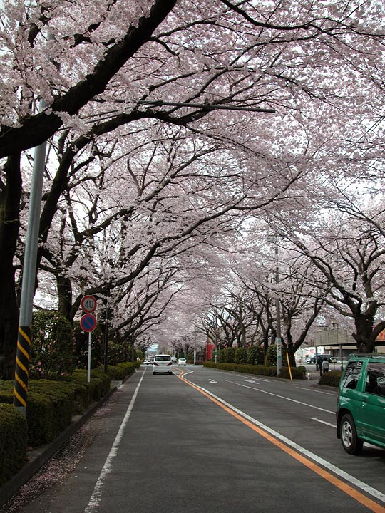 西側の道路は道幅が狭めなので、春には桜のトンネルとなる。