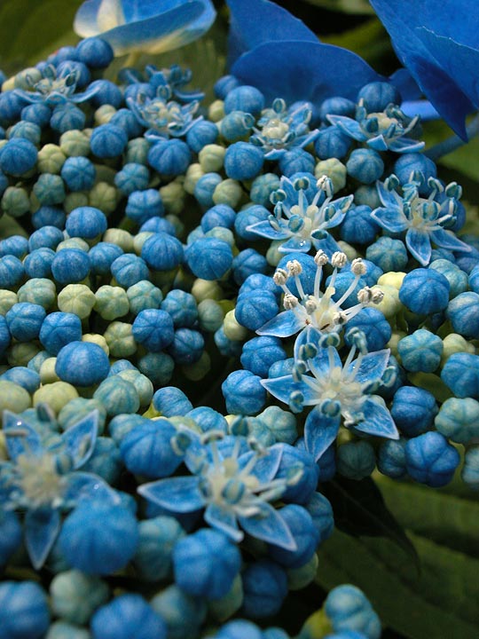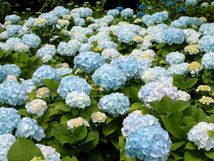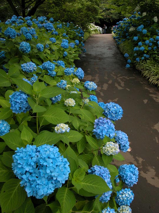 鮮やかな青いアジサイが満開。