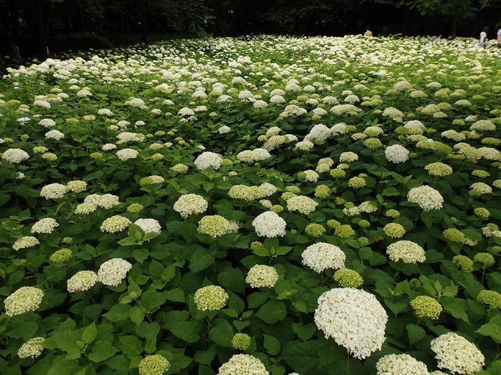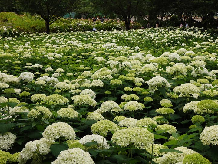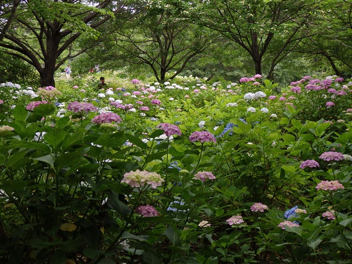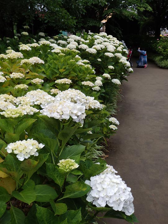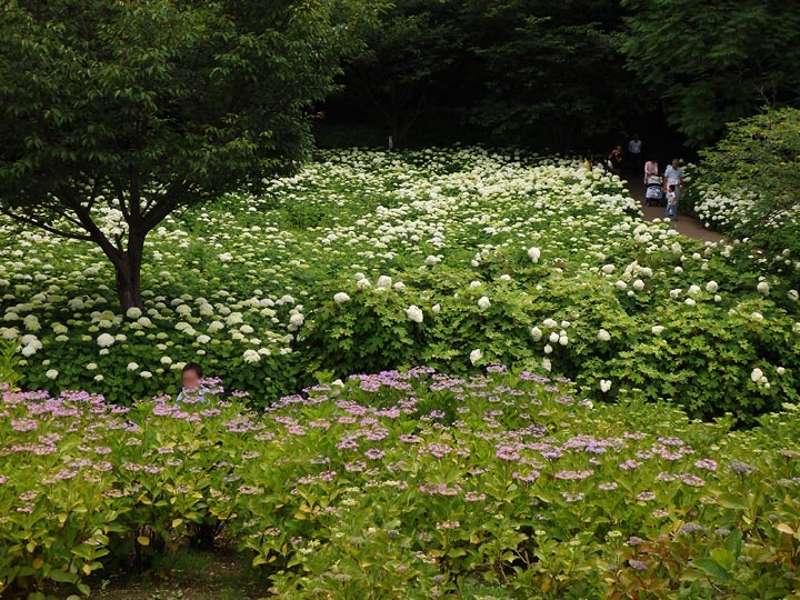 奥に見える白いアジサイの群生場所が、相模原北公園のアジサイ園のもっとも広い区画。