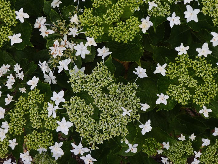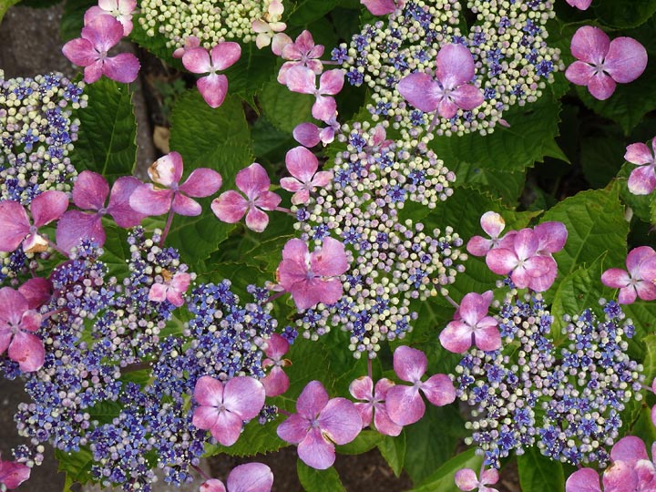 ガクが玉のように開いている一般的なアジサイもいいが、小さな花の集合体の周囲にいくつかのガクが開いているアジサイも華やかでいい。