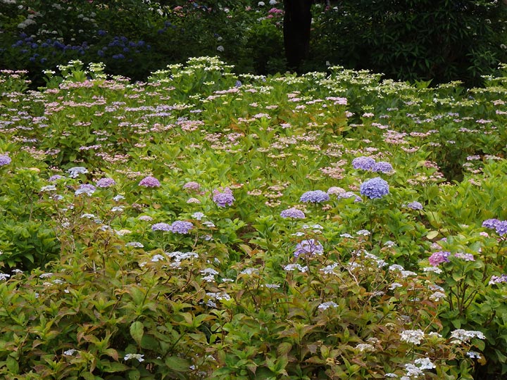 アジサイ園の丘の坂道に平べったいアジサイが植えられていて、上から見るとアジサイの波のように見える。