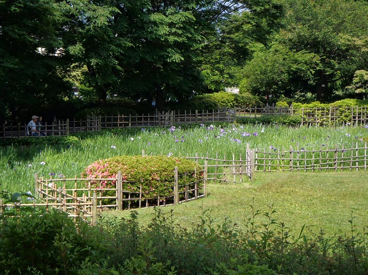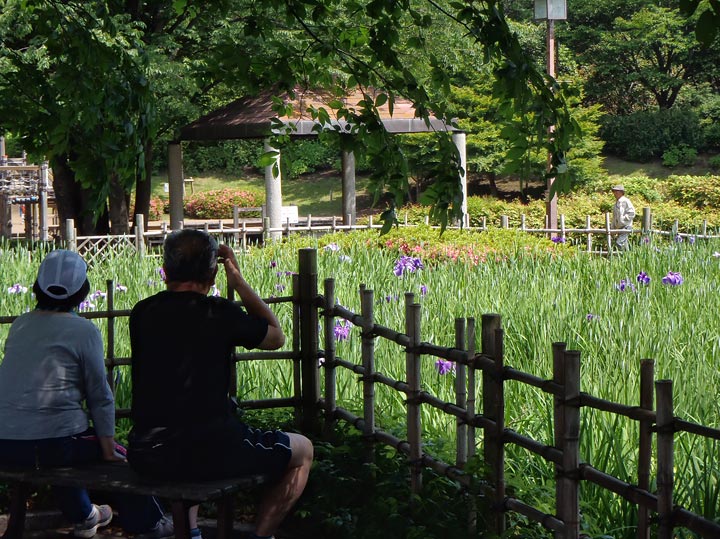 ショウブ田のまわりには、いくつかベンチがあり、多くの人が腰を下ろしてショウブを見ながら話し込んでいる。