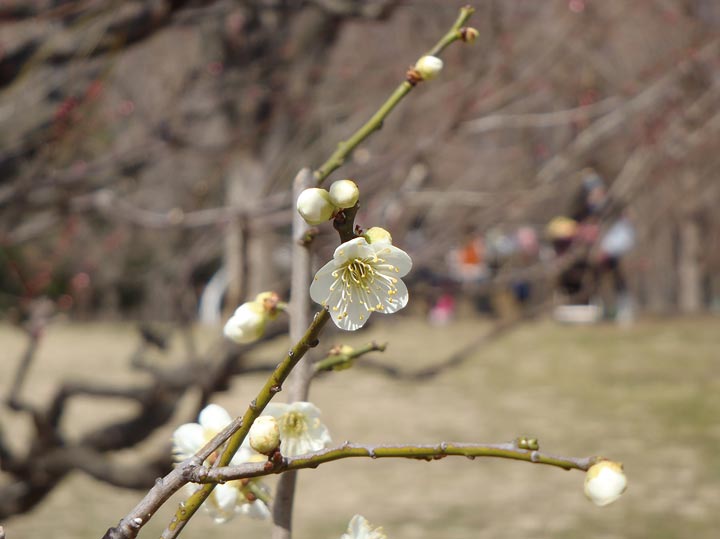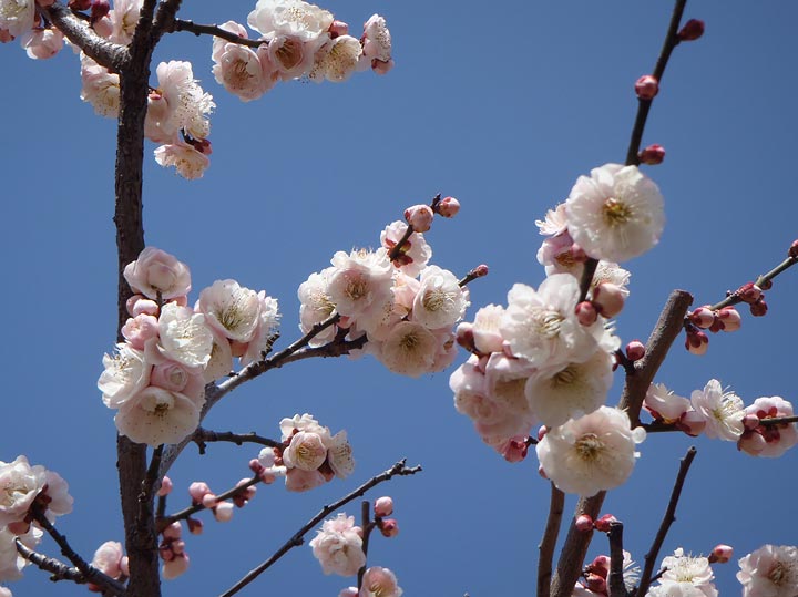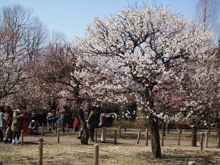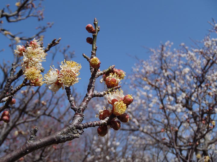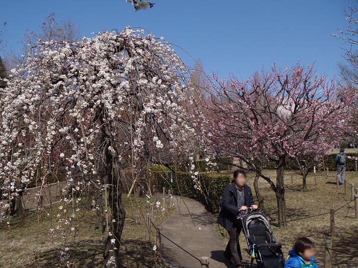 3/16に行ったときには、4、5分咲き程度だった開花は、遅咲きの梅を除いて、満開に近い。