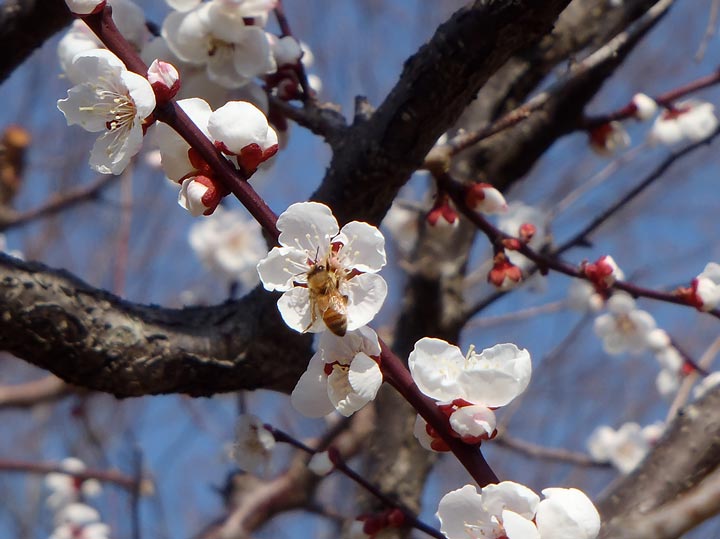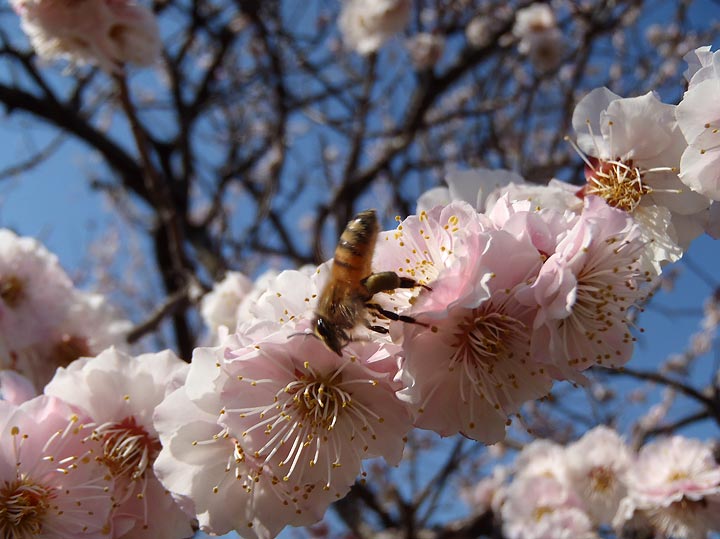 多くのミツバチが、花から花へ花粉を集めて飛び回っていました。