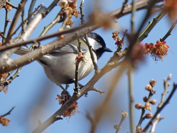 シジュウカラは花から花へ忙しなく飛び移るので、望遠にしてピントを合わせている間に画面から消えてしまう。