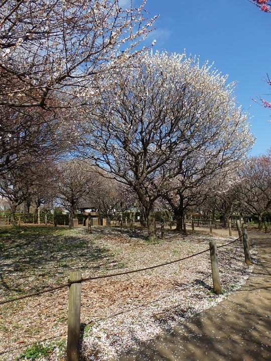 花は1~2本の遅咲きの木が見ごろで、ほとんどの梅が咲き終わり地面には花びらが舞っている状況でした。