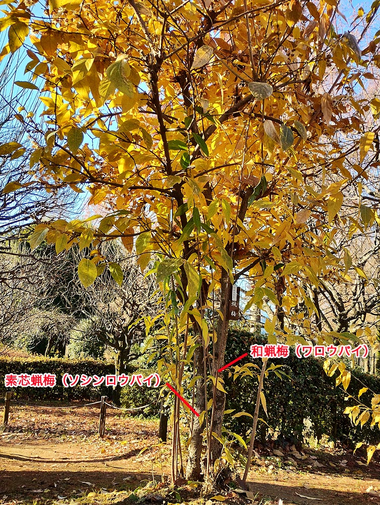 左の幹が素芯蝋梅(ソシンロウバイ)で右の幹が和蝋梅(ワロウバイ)