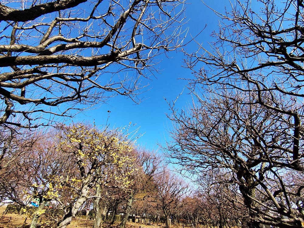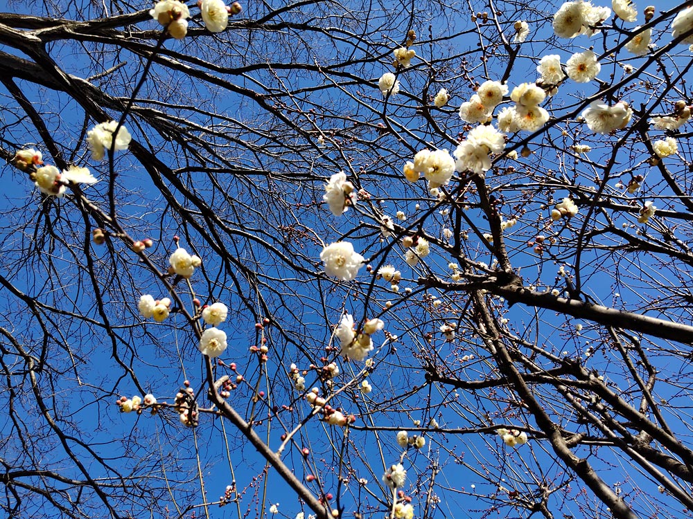 早咲きの梅の木数本が花を咲かせ始めており、全体的には1部咲き弱といったところ。