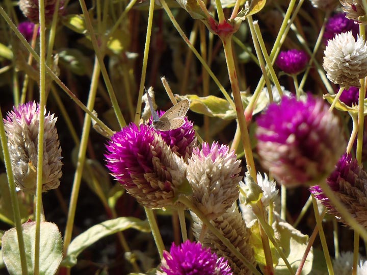 この花の前の立て札には、「アカバナミツマタ」とありましたが、これは千日紅です。